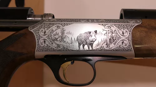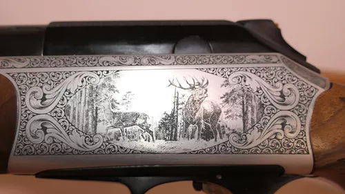 Nouvelle carcasse anodisée gris vieil argent et nouvelle gravure avec une ornementation composée de volutes en double anglaise gravées en demi-fond creux et de nouvelles scènes de chasses gravées en taille douce sur les deux côtés de la carcasse