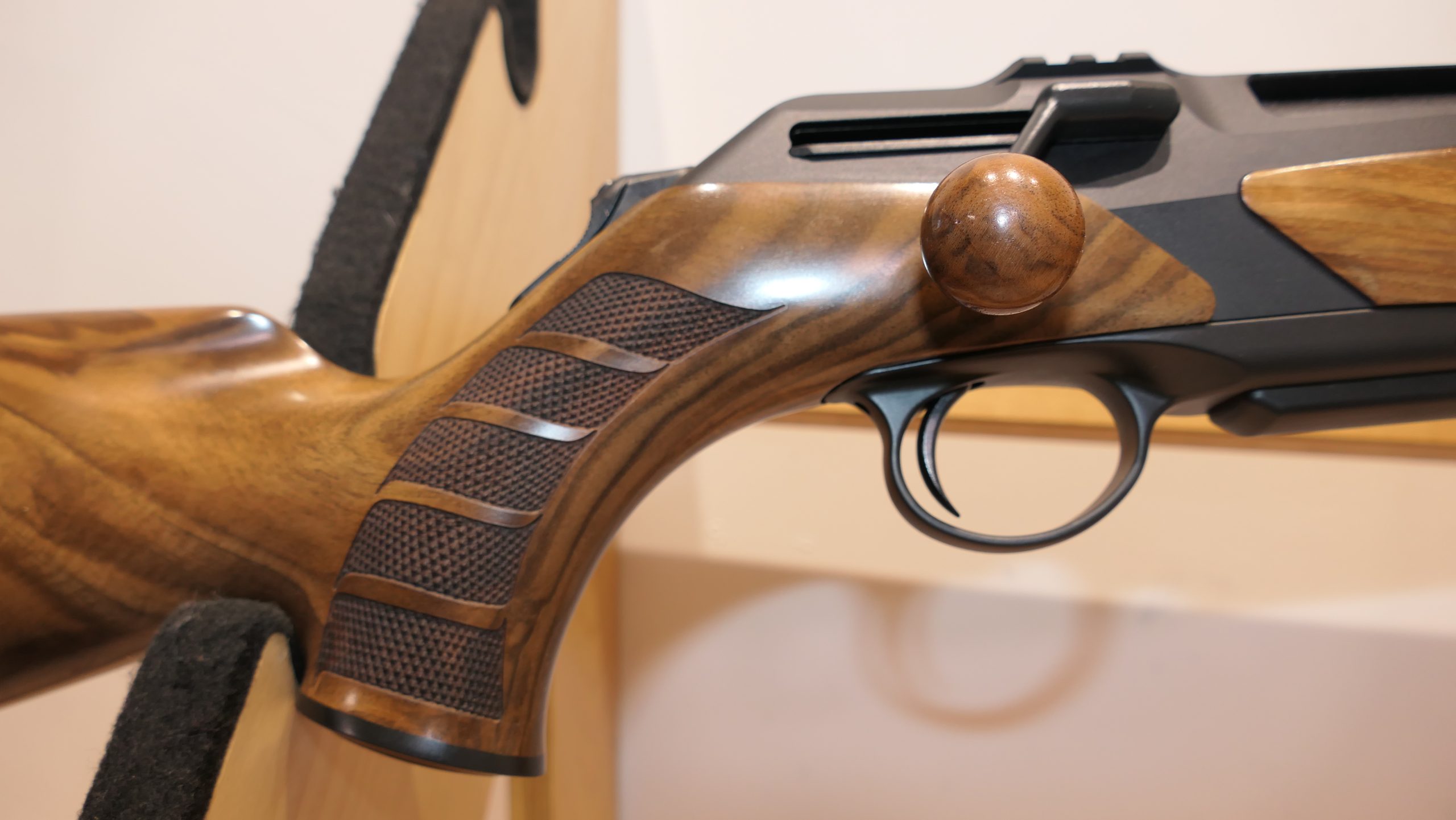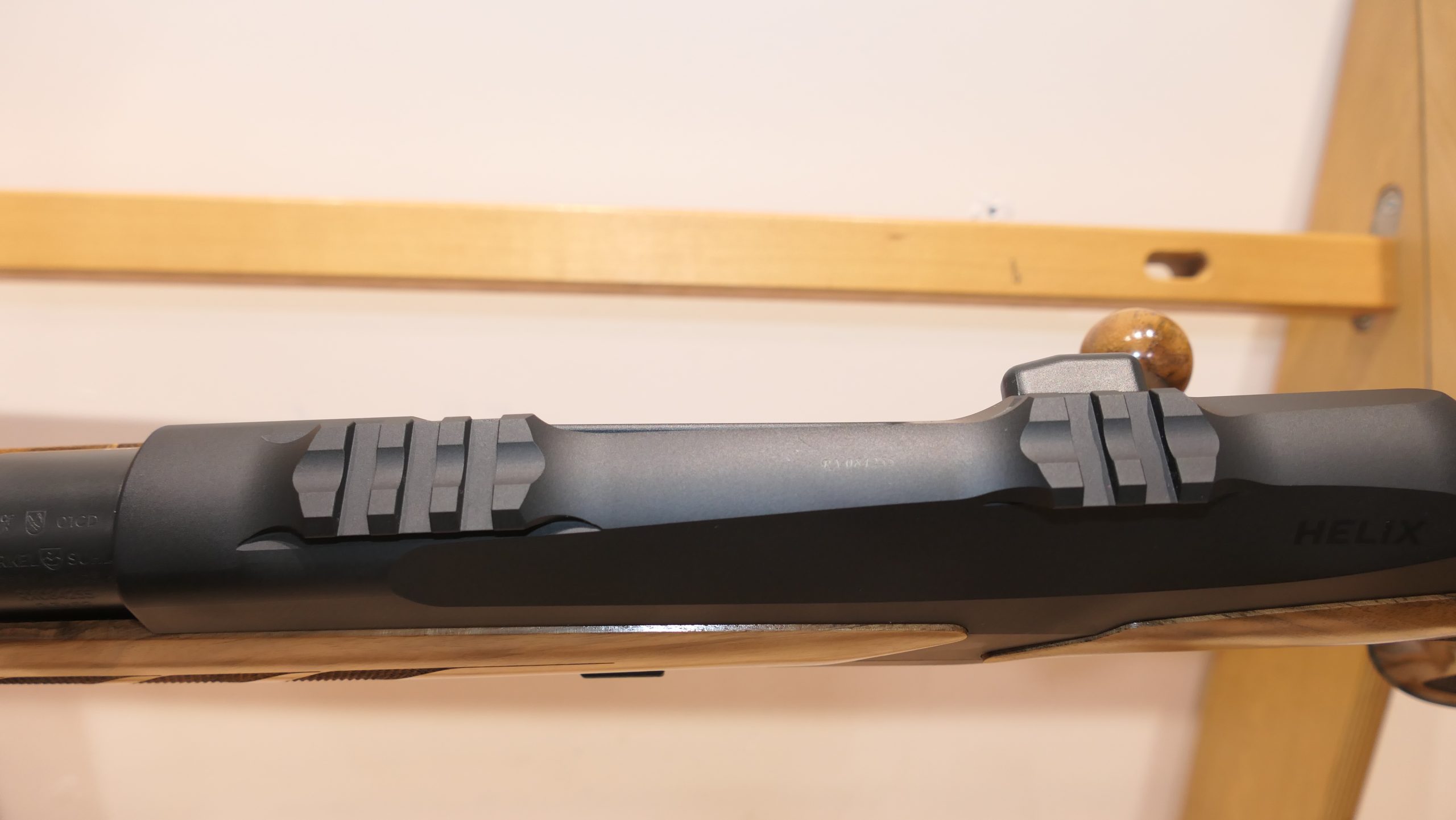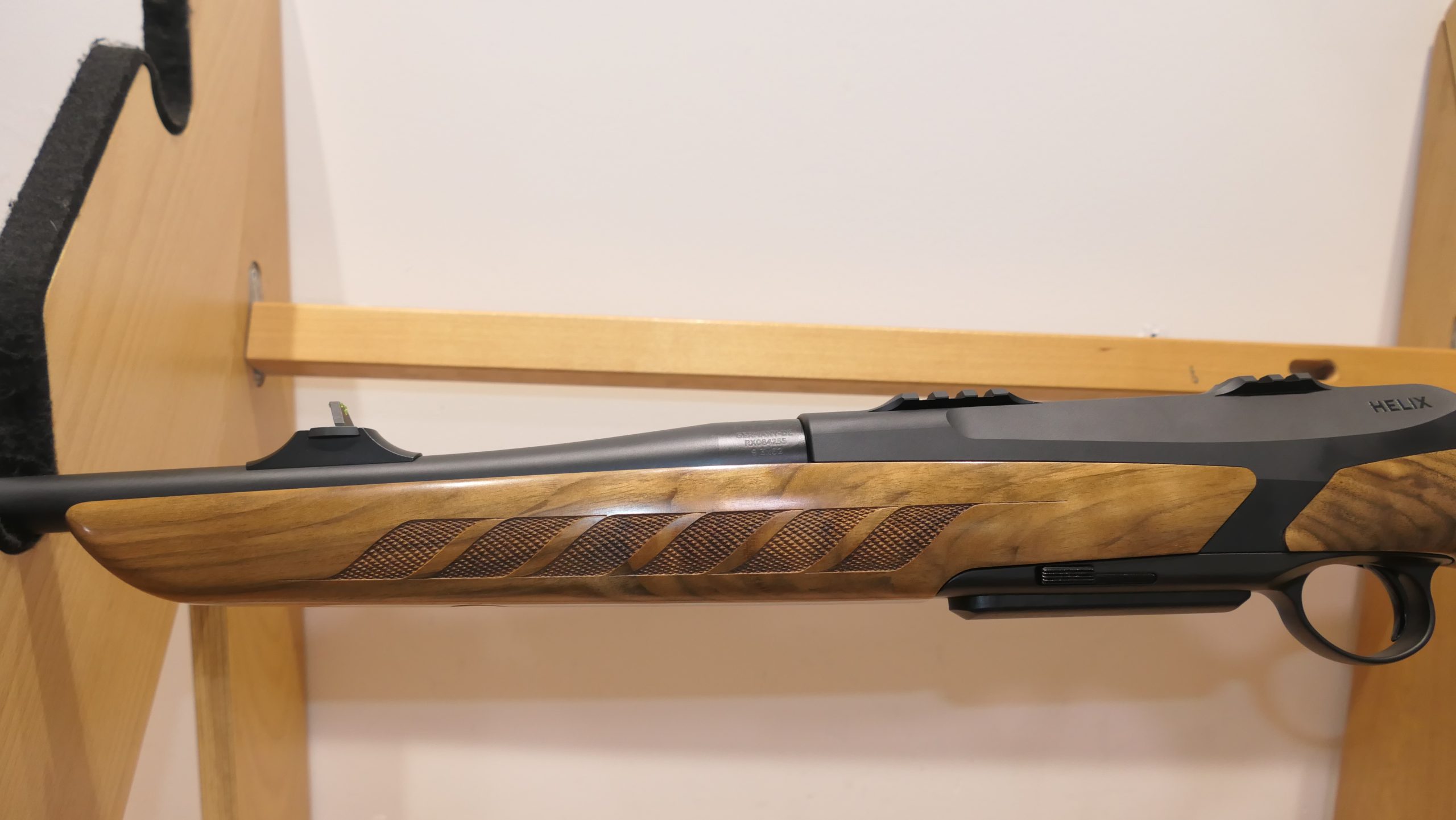 Merkel RX Helix Elegance  équipée d’un levier boule en bois. Cette carabine RX Helix se distingue par son réarmement linéaire ultra-rapide, avec une course de seulement 6,5 cm. Sa culasse est soigneusement confinée dans le boîtier, et elle est pourvue d’un armurier séparé. La détente offre une sensation douce, nette et précise. Son chargeur amovible tombant, d’une capacité de 3+1, est compatible avec tous les calibres. Le vérouillage rotatif à 6 tenons dans le canon assure une sécurité optimale. De plus, elle dispose d’un système de montage intégré. Cette arme peut être entièrement démontée en quelques secondes et sans outils, permettant ainsi, par exemple, l’interchangeabilité des calibres. Le bois de noyer grade 5 confère une touche d’élégance supplémentaire à cette carabine exceptionnelle.