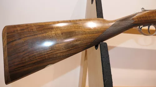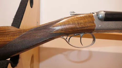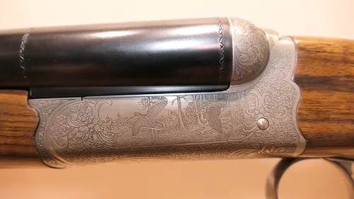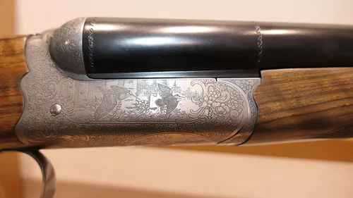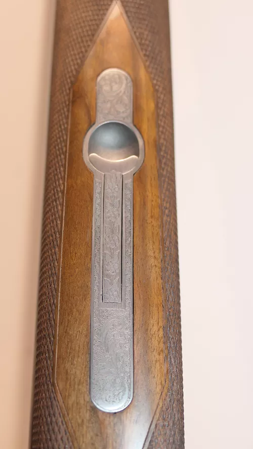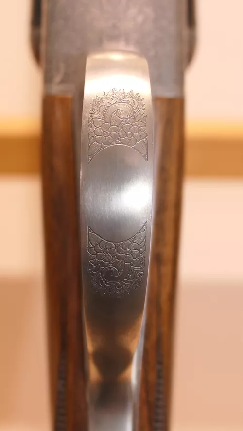 Le modèle UGP est à Extracteur et le modèle RGP à Éjecteur.Nouvelle forme arrondie pour la bascule et les coquilles.Canon à double crochet parallèle avec bande fuyante (Bande plume en option).Nouvelle gravure ornementale en fine anglaise continue sur l’ensemble de la bascule et nouvelles scènes de chasse gravées sur les deux côtés et le dessous de la bascule.Crosse anglaise avec relime arrondie en Noyer 2 Étoiles pour le modèle UGP et 3 Étoiles pour le modèle RGP.Plaque de couche en Noyer quadrillé et devant fin à auget.Ponçage à l’huile et quadrille main. Batterie de type « Blitz » à double détente et pontet court.Livré en mallette de transport Chapuis Armes en ABS thermoformé et serrures à codes.