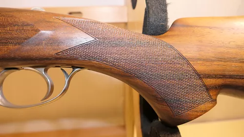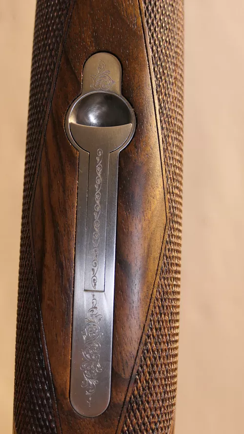 La crosse et le devant sont en noyer Turque sélectionné avec un quadrillage fin.La plaque de couche est en bois.
