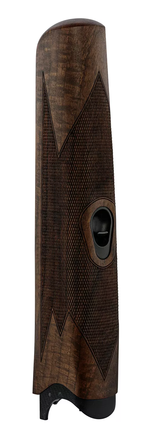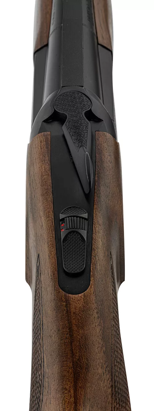 Le contour de la crosse a ainsi été majoré tant au busc qu’au niveau de la poignée pistolet, sa masse plus importante permettant d’avoir un équilibre plus orienté vers l’arrière de l’arme.