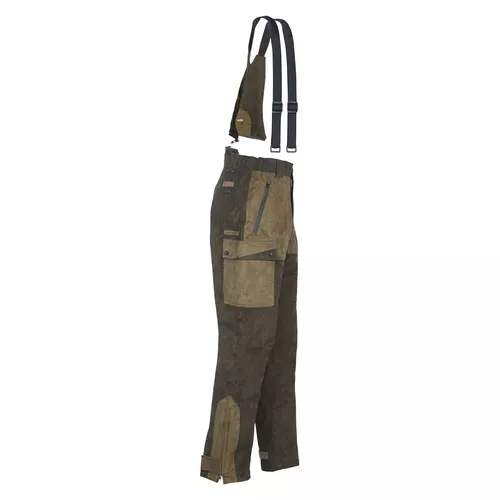 Salopette de chasse de la ligne Grand Nord. 6 poches plus 1 poche couteau, bretelles élastiques ajustables, bavette dos amovible et bas renforcés, bas zippés ajustables. Membrane imperméable et coutures étanches.